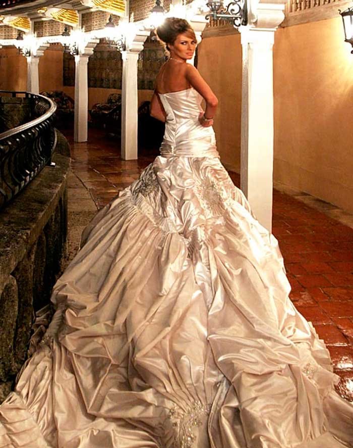 Мелания Трамп — это образец женственности и невероятной грации. Когда она выходила замуж за президента Америки, пошивом свадебного платья занимался сам Диор. Шлейф длинной в 4 метра создавал невероятный эффект, а само платье весило более 27 кг. А все из-за того, что оно было расшито жемчугом и драгоценными камнями. Только посмотрите на эту красоту!