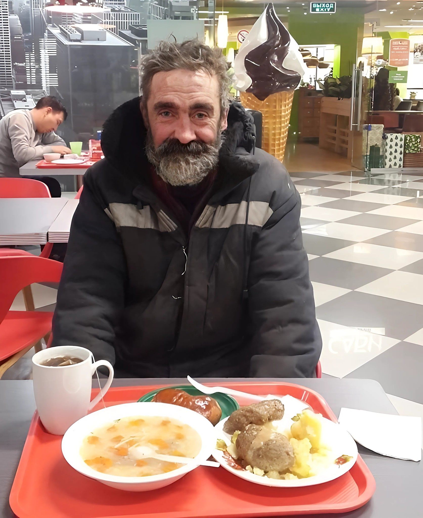 Позже оказалось, что это была проверка от хозяина кафе. Он хотел проверить, достаточно ли дружелюбен к посетителям его персонал. В роли «бомжа» был его близкий друг.